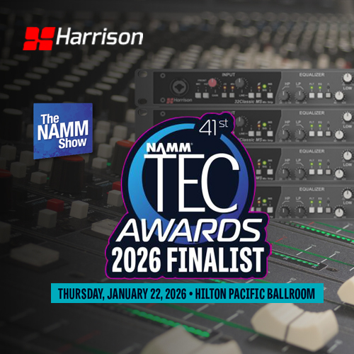 NEW 2026.01.07Harrison Audio 32Classic 16 通道调音台入围 "大型调音台" 类别,32Classic MS Mix Strip模拟通道条带入围 "话筒放大器" 类别...