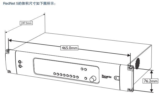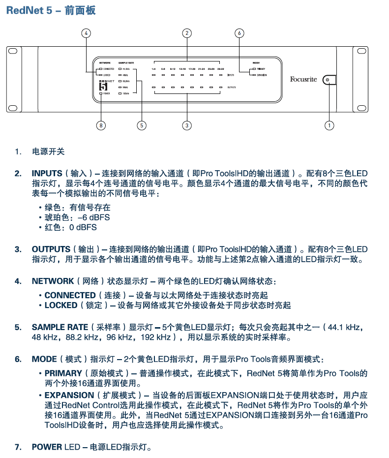 前面板配有LED指示灯,用于显示网络状态、采样率、操作模式;此外还有用来显示数字输入和输出(4个一组)信号电平的LED指示灯。