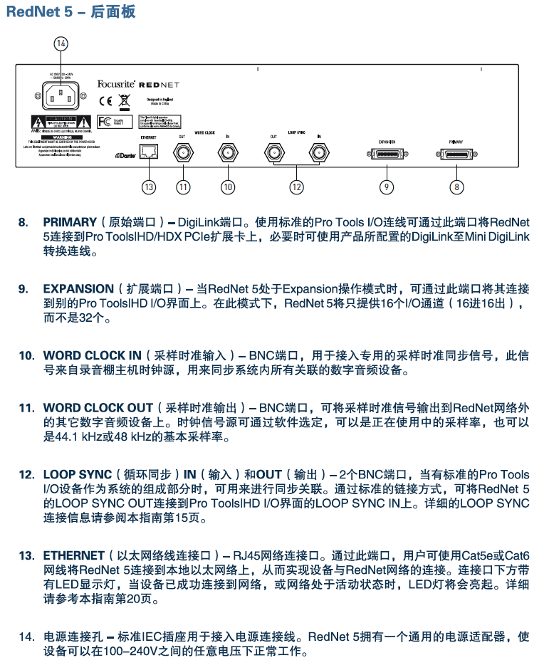通过Pro Tools|HDX系统,用户可同时使用多达6个的RedNet5(如使用的是Pro Tools|HD系统则为3个),这使得Pro Tools HDX可同时承载多达192个输入通道和192个输出通道(如使用的是Pro Tools|HD系统则为96个),所有音频信号都通过RedNet网络在各个RedNet 5之间进行传输。RedNet 5还配有Word Clock(采样时准)输入和输出端口,用户可将其连接到RedNet网络外的其它数字音频设备,作为主机或副机使用。