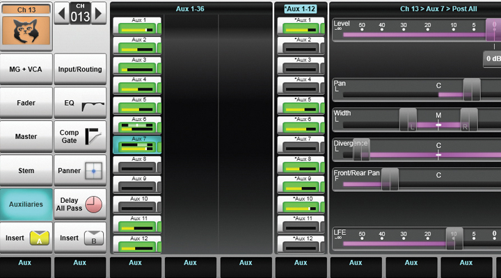 SSL Live引入一种极为强大的全新信号路径类型,我们称之为支干编组(Stem Group),提供其它现场调音台所不具备的令人惊叹的灵活路由能力。支干编组是一种独特的多功能混音总线,集辅助编组、输入、Aux和矩阵母线于一体。Stem编组提供6个不同的路由发送点,包括口子发送(Post Trim), 推前/推后发送(Pre/Post Fader), A/B插入点后发送(Post Insert A/B),效果器后推前发送(Post All Processing),可发送到Aux、Master、甚至其它支干编组,组成网状的多级编组(Subgroup)。和所有其它信号路径类型一样,它们可以配置成单声道、立体声、LCR、4.0或5.1。可设置为具备更强大处理能力的全功能支干编组(Full)和节约系统运算资源的基本功能支干编组(Dry)。支干编组提供真正全新、强大的方法,创建出一个极为灵活的混音环境,让用户专注于思考如何进行混音。