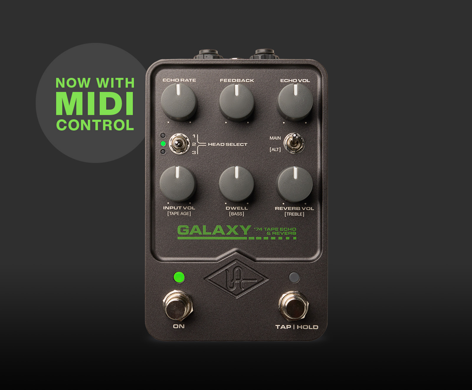Universal Audio > GPM-GLXY /uploadfile/2025/1118/202511181763453489.jpg /uploadfile/2023/0411/202304111681193609.jpg GPM-GLXY GPM-GLXY Galaxy '74 磁带回声和混响效果器 Galaxy '74 磁带回声和混响效果器 立体声延迟踏板,具有 70 年代中期经典的模拟回声效果和弹簧混响、节拍速度、可调节的实时效果和振荡声音、可通过 UAFX 移动应用程序进行自定义以及 USB MIDI 支持。 立体声延迟踏板,具有 70 年代中期经典的模拟回声效果和弹簧混响、节拍速度、可调节的实时效果和振荡声音、可通过 UAFX 移动应用程序进行自定义以及 USB MIDI 支持。 TAG: 产品详情 技术参数 资源下载 探索模拟时间和空间的极限。 Galaxy '74 Tape Echo & Reverb建立在获奖的UAFX双引擎处理和对声音真实性的无止境的渴求上,它捕捉了70年代中期标志性的Roland Space Echo*硬件的温暖、多变、无尽的模拟效果,让你的脚下有一个无限可能的单块。 经典多磁头磁带延迟机制的完整建模 标志性模拟前置放大器部分的真实捕捉 超出原始硬件的效果的延迟时间加倍 使用 UAFX Control 应用程序调整脚踏开关设置以添加敲击速度、调整实时效果并自定义独特的振荡声音 温暖的令人惊艳的质感 获得标志性的磁带质感,充满了原型Space Echo单元的音乐感、飘动感和饱和度,以及加倍的延迟时间和敲击节奏--来创造原始硬件上不可能的节奏细分。你甚至可以用震荡来实时扭曲空间,以获得疯狂的失控延迟效果。 迷失在空旷的弹簧混响中 只有Galaxy '74为你提供了原版弹簧混响的真实效果--还有一个Dwell控制,以获得更狂野的声音--将你的音色投向宇宙,其质地将这一神圣硬件的其他仿真器甩在后面,成为一蓬太空尘埃。 用双立体声效果引擎穿越宇宙 Galaxy '74的强大引擎为每个混响和延时运行独立的立体实例--获得惊人的三维立体深度,这是任何其他单块效果器无法比拟的。 用移动应用程序对您的踏板个性化 通过UAFX控制应用程序,你可以调整脚踏开关的设置,调整实时效果,并定制独特的振荡声音。 电源要求 隔离式9VDC,中间为负极,最小400mA(单独出售)输入 2 x ¼” TS 输出 2 x ¼” TS 高 2.56” (6.5 cm)宽 3.62” (9.2 cm)长 5.55” (14.1 cm)重 1.24 lbs (0.567 kg) 电源要求: 隔离式9VDC,中间为负极,最小400mA(单独出售)special-dmt输入: 2 x ¼” TS special-dmt输出: 2 x ¼” TS special-dmt高: 2.56” (6.5 cm)special-dmt宽: 3.62” (9.2 cm)special-dmt长: 5.55” (14.1 cm)special-dmt重: 1.24 lbs (0.567 kg)special-dmt 产品介绍: