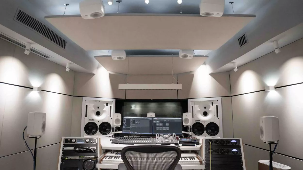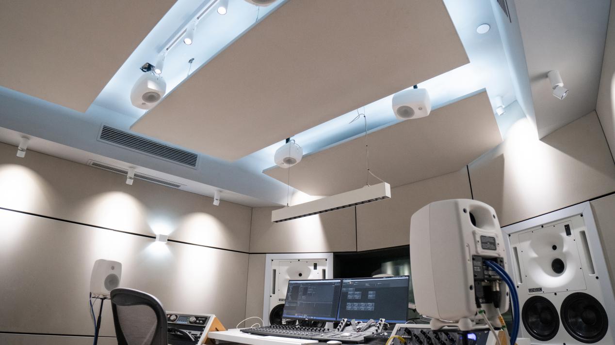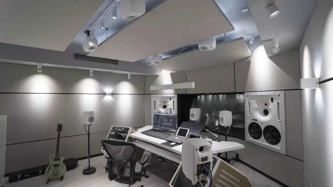 这间 5.1.4 工作室在视觉设计上整体采用了浅色调,显得干净敞亮。大大小小的所有真力音箱也都特意选用了“极地白”定制款。