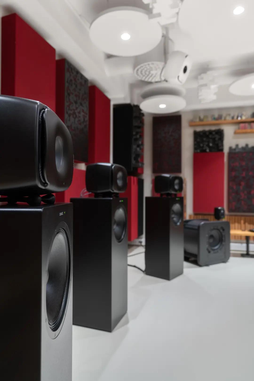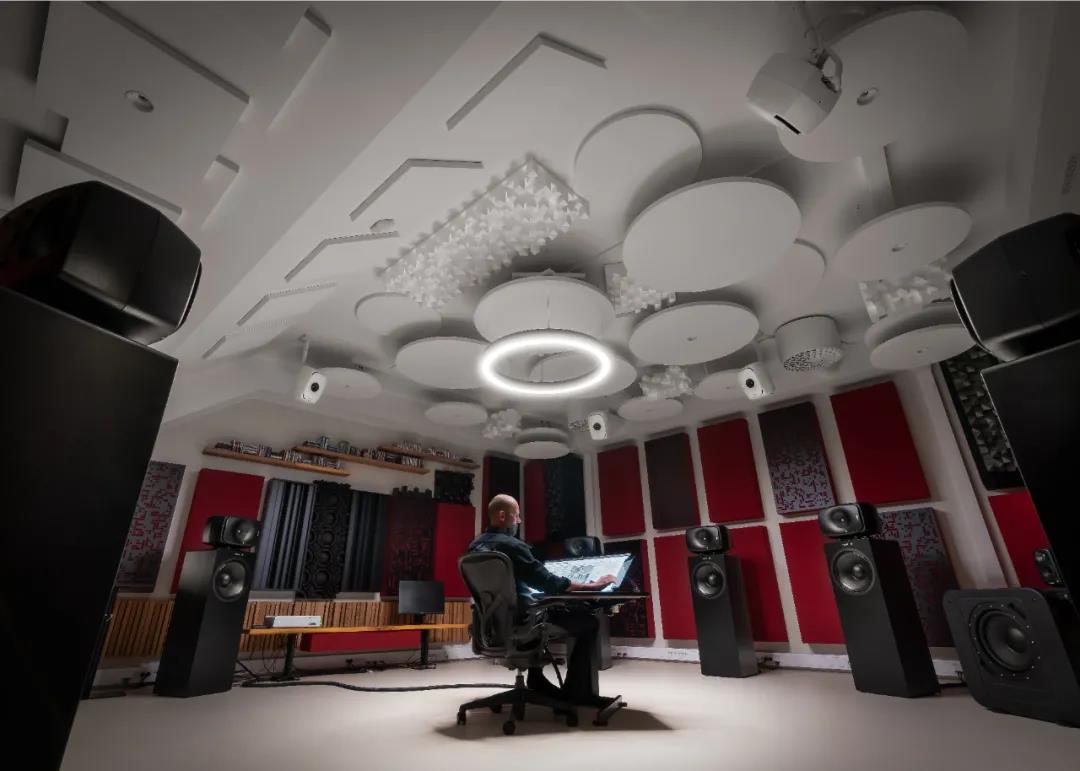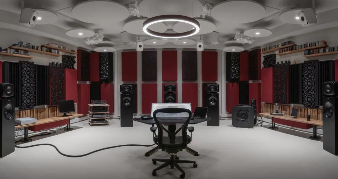 这间工作室是专门为沉浸式音乐的编辑、混音和母带制作而设计的。监听系统兼容杜比全景声(Dolby Atmos)和 Auro-3D,在音箱的选择上也花费了心思:包括 7 只 8351B 同轴三分频音箱,并且每一只都配合了 W371A 自适应低音系统;顶部音箱选用 4 只尺寸更紧凑的 8341A 同轴三分频音箱;LFE 声道由一只 7380A 超低音箱负责重放。