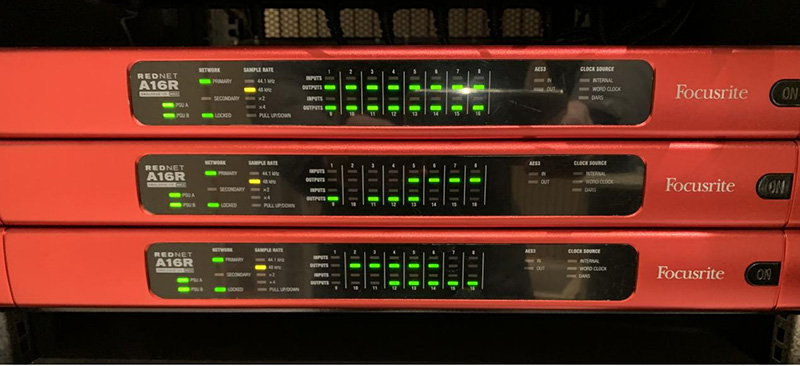 全景声系统音频传输则采用了3台支持Dante网络音频的Focusrite RedNet A16 录音级16通道传输转换器,实现了48通道的无损网络音频传输。采用最新Dante网络音频控制,使得整个系统的音频信号调度路由都非常便捷,更适应当前师生的计算机操作习惯,更容易上手操作。