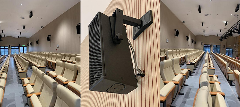 整个系统的主扩全频扬声器为VIO X10,共7只,超低频扬声器为VIO S118,共4只,台唇补声扬声器为VIO X205,共7只。天花环绕音箱为VIO X205,共10只,顶部按声场计算,共分两组,每组五只吊挂安装。水平环绕声音箱为VIO X205,共12只,按现场左后右平均分布,壁挂安装。舞台返听扬声器VIO W10,共4只,舞台返听扬声器采用可调角度设计,有四种不同听音角度可选,在舞台上可灵活适用于各类演出需求。