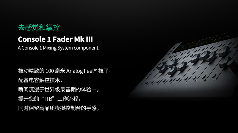 Console 1 Fader Mk III 配备十个高分辨率屏幕,轻松解决轨道显示问题。屏幕可以显示可定制的信息,如轨道名称、编号、音量表、声像和颜色,确保用户始终清楚自己的位置。推子的 Analog Feel™ 模拟手感经过优化,搭配电容触控技术,带来顺滑的操作体验,触觉反馈还能直观传递关键信息。