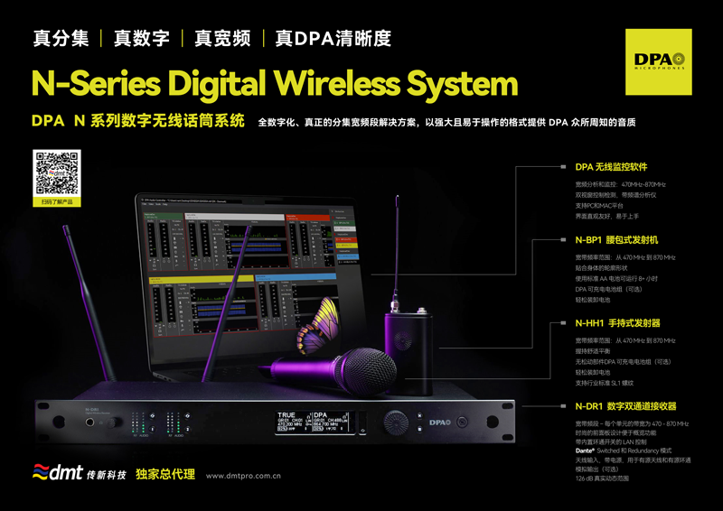 N 系列是一种全数字化、真正的分集宽频段解决方案,以强大且易于操作的格式提供 DPA 众所周知的音质。