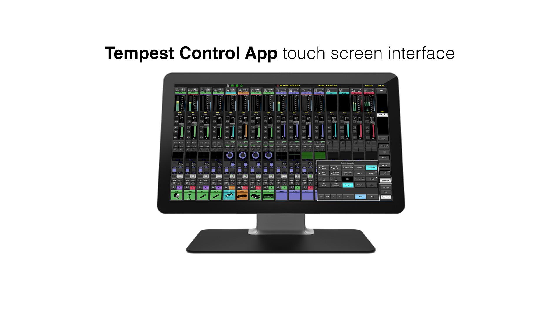 Tempest 控制应用界面(TCA)为了提供更高的灵活性,SSL 还与 Mutos 合作,根据 Stop & Go 公司不断变化的需求调整了调音台布局:OB6 转播车的 48 推子控制界面分为两个部分,而 OB4 转播车的 S400 双机架单元则与一个连接至 SSL Tempest Control App(TCA)的16 个推子远端摇控模块相邻摆放。Mutos 表示,TCA 控制应用程序和推子模块提供了物理冗余备份功能,可适用于远程操作场景,并能让 Stop & Go 公司实现双人操作模式。